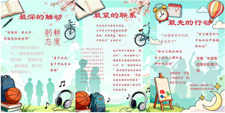 “本次培训中,让您对‘教育家精神’/‘好老师’内涵最有触动的一点是什么?”这一问题引导师生聚焦培训核心内容。教师党员们普遍被“心有大我、至诚报国”的理想信念与“乐教爱生、甘于奉献”的仁爱之心所打动。多位教师表示,这次学习让他们重新认识到教育不仅是知识的传递,更是价值的引领和心灵的唤醒,坚定了在英语教学中自然融入家国情怀与文化自信的决心。